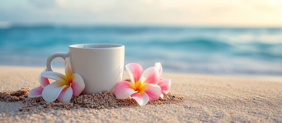 Beautiful bouquet of flowers in blue vase stands near the cup of coffee on the table
