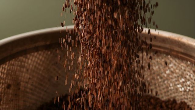 Pouring coffee grounds forming dense vertical stream over round metal sieve rim