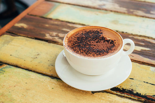 Hot cappuccino coffee in the cup on wood table. Cappuccino mixed with espresso coffee, milk is a fine foam and milk pressurized steam. Sometime garnished with cinnamon powder or cocoa powder on coffee