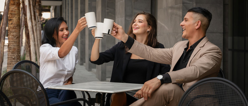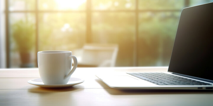 Close up of a man's hands holding coffee cup typing on laptop aside notebook while sitting at table.