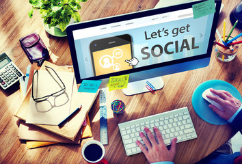 Coworkers sharing digital social network hologram while having coffee at wooden table