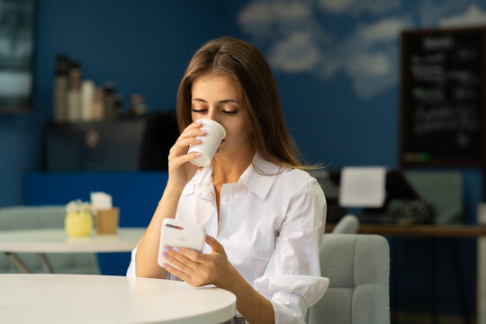 Young business woman drinking coffee and looking at smartphone in cafe enjoying coffee break.Happy female university student using mobile phone.