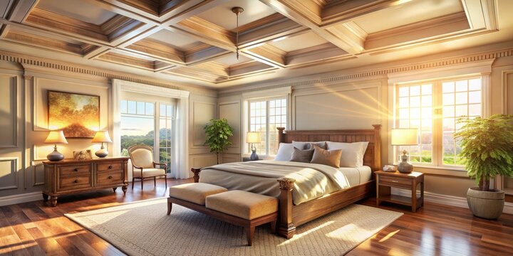 Soft morning light pours through the window, illuminating a serene sunlit bedroom with coffered ceiling, wooden furniture and elegant decor, serenity, coffered ceiling