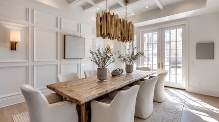 Elegant Modern Dining Room Interior with Live Edge Wooden Table and Gold Chandelier