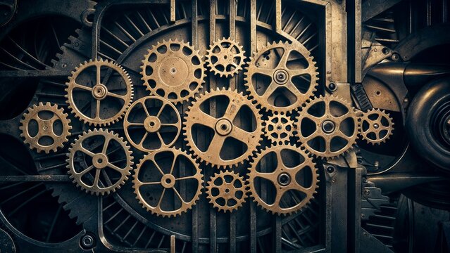 A complex system of brass gears and cogs interlocking in a dark, industrial setting.