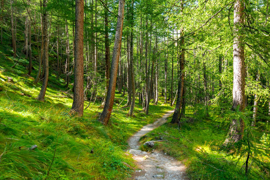 Beautiful forest at sunset with green grass and pine trees - Italian Alps Cogne Aosta Valley Grand Paradis National Park