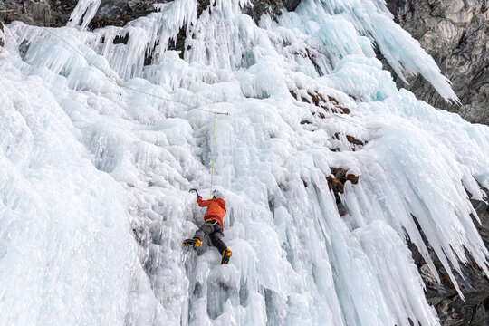 Ice climbing on frozen waterfall, Cogne, Aosta Valley, Italy