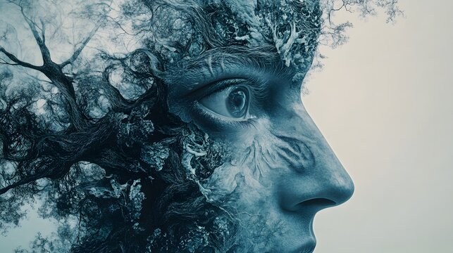 Serene senior woman close-up with glowing neural network lights, aging wisdom concept