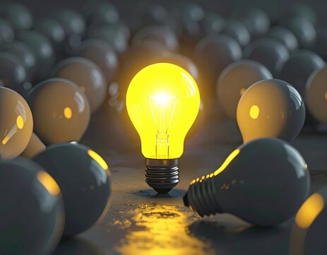 Human finger touching a glowing incandescent bulb among several unlit ones against a dark background