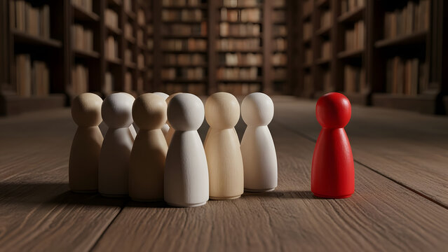 Red wooden peg doll standing apart from a group of seven light-colored peg dolls on a wooden floor in a blurred library setting.