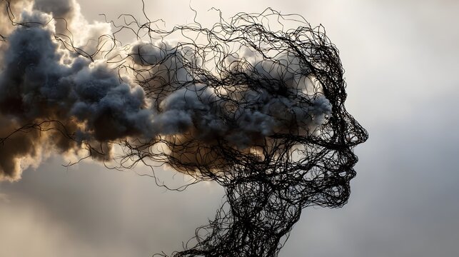 Abstract silhouette of human head filled with tangled wires or clouds. Concept : Mental health, anxiety, overthinking, emotional stress, cognitive overload, psychological struggle, abstract expression