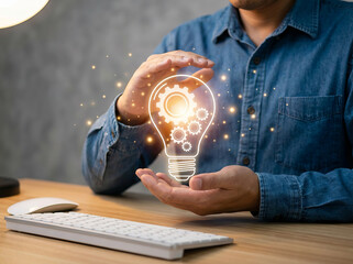 Innovation and creative solution concept. Man holding glowing lightbulb with internal gears for business strategy.