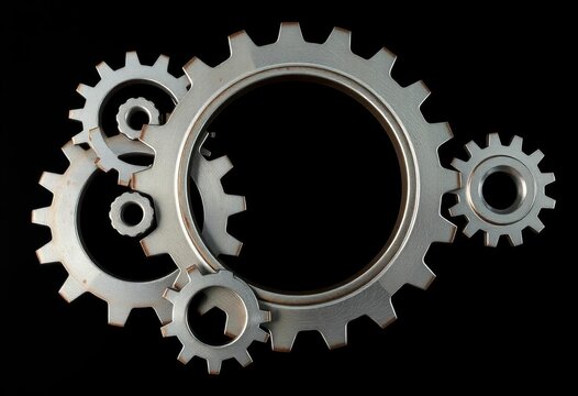 Interlocking metal gears isolated on black background, texture, components