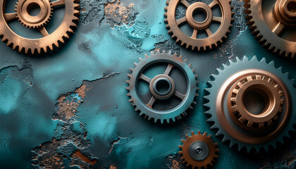 Bronze and steel gears merging with cyan digital tiles representing industry 4.0