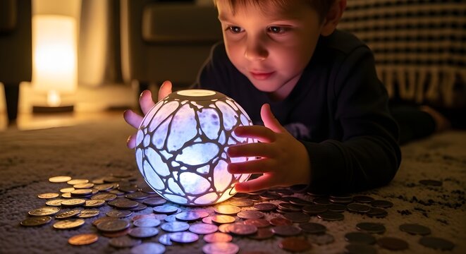 A young boy lies on the floor with a glowing orb surrounded by coins in a dimly lit room indoors