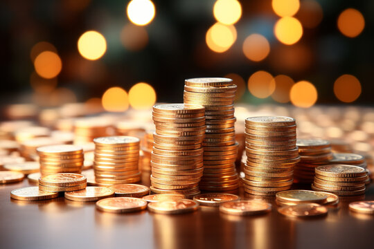 Shiny stacks of coins piled high on a desk, symbolizing wealth and the art of saving money.