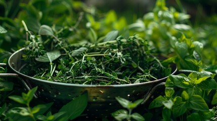 Fresh basil and thyme in a colander for kitchen or cooking themed designs