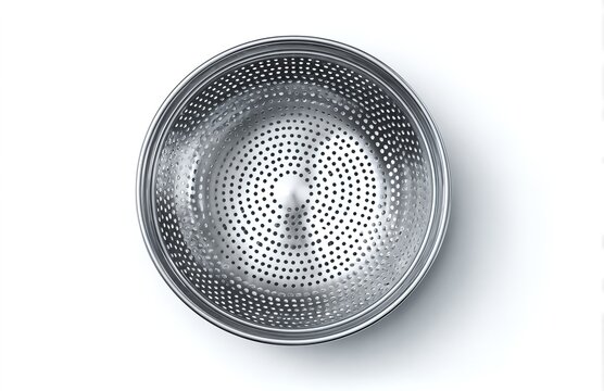 Colander with a rainbow iridescent finish in a metal bowl. Top down view of colorful kitchenware on a textured surface.