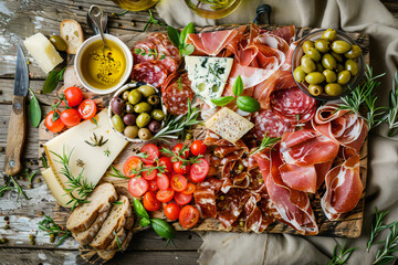 Traditional appetizer platter with salami, prosciutto, and cheese