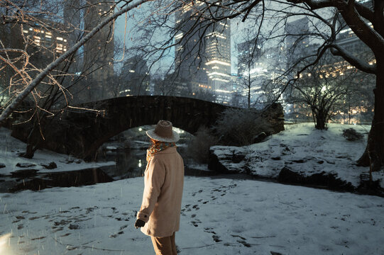 Woman by Snowy Stone Bridge in Central Park with NYC View