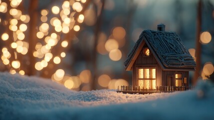 Magical winter forest path illuminated by enchanting golden fairy lights and falling snow creates a dreamlike, festive atmosphere