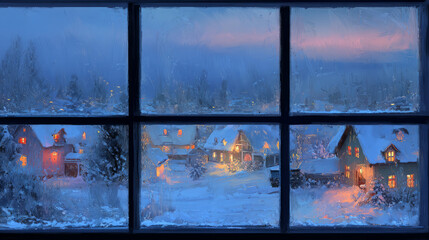 Miniature Snowy Christmas Village Through Window