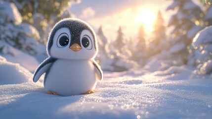 Cute penguin in snowy forest scene
