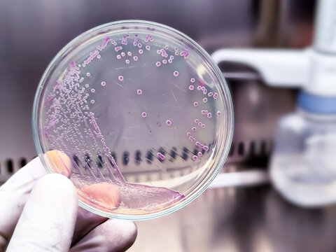 A microbiological culture Petri dish with a colonies of the pathogenic bacterium Escherichia coli (E. coli)