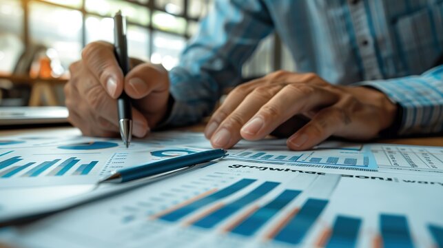 Two architects review blueprints and discuss a project's progress, using a large screen displaying charts and graphs in a modern .