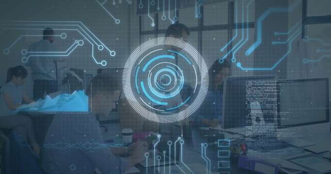 Displaying HUD overlay above team coding in open-plan office, with monitors, laptops and tablet