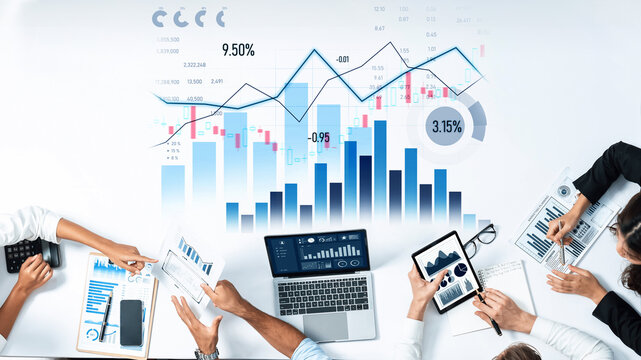 Team of analysts analyzing financial data with digital overlay