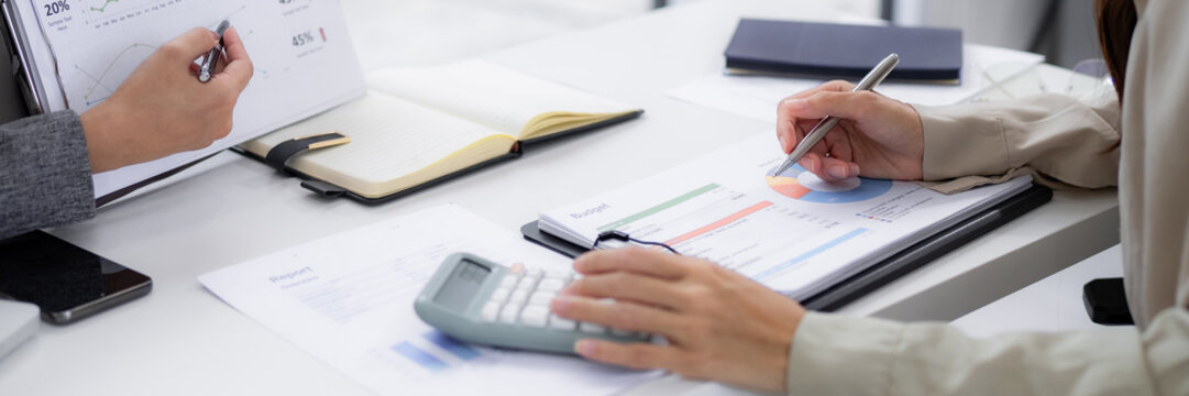 Businesswomen discussing financial analytics in modern office
