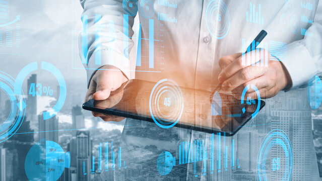 A business professional analyzing futuristic digital graphs and analytics dashboards on a tablet, showcasing data visualization, financial growth, and business intelligence in a modern tech environmen