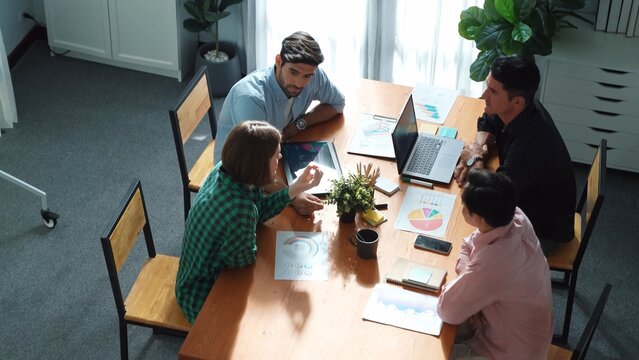 Skilled project manager walking at table while colleague brainstorm idea. Business team working together to plan marketing strategy while looking at data analysis or financial statistic. Convocation.