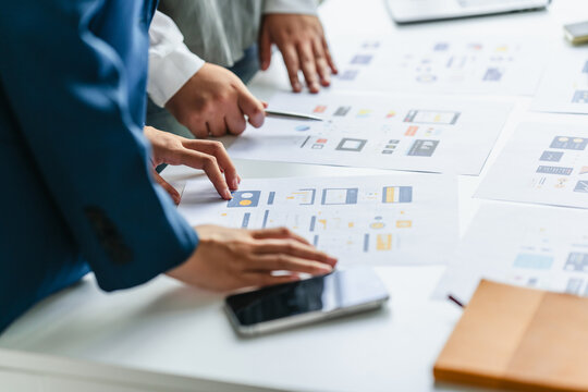 UI designer and UX specialist collaborating on digital prototypes in brainstorm
