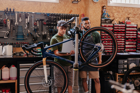 Bicycle mechanics using digital tablet discussing a repair in their workshop
