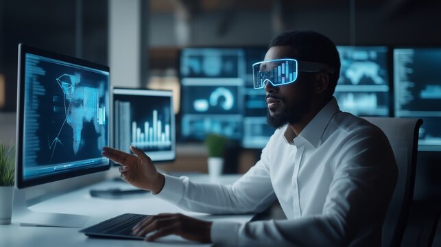Businessman uses augmented reality glasses in a modern office to interact with digital data overlays and holographic graphs