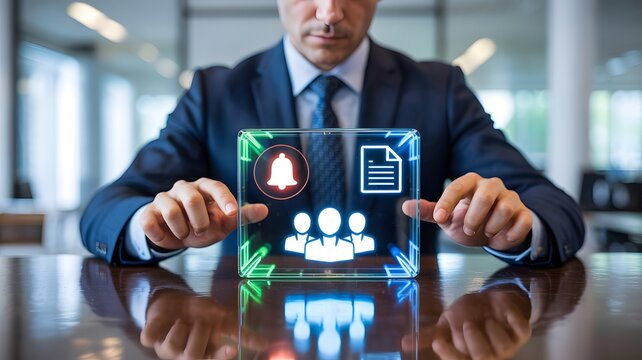 Businessman interacting with a futuristic holographic interface displaying business icons