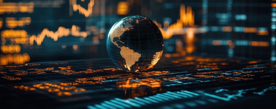 A digital globe shines amidst data visualizations, representing global connectivity and financial trends in a high-tech environment.