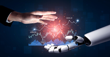 A human hand reaches toward a robotic hand amidst digital graphs showcasing finance and technology, representing future collaboration between humans and machines. Scalp