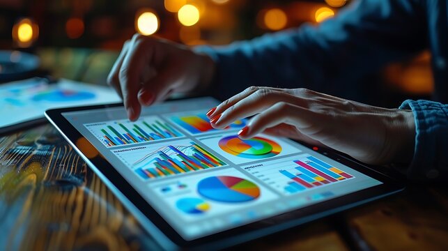 Two hands in a close-up shot interacting with a tablet displaying various data charts, with scattered analytic reports in the background.