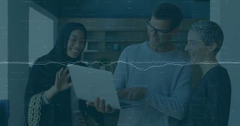 Diverse team collaborating over laptop and documents in modern open-plan office