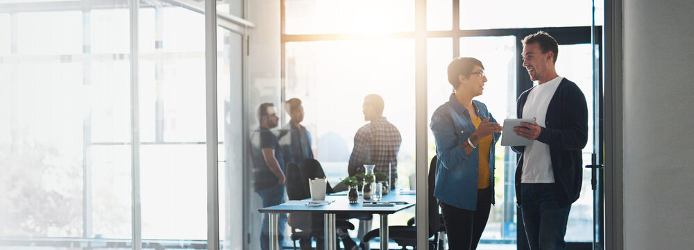 Banner, tablet and business people in office in meeting for research project, online website and discussion. Professional, corporate space and workers on digital tech for planning, teamwork or report