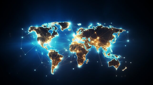 A nighttime world map showing illuminated cities connected by glowing lines, representing global communication.