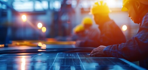 A yellow hard hat rests on blueprints at a construction site, with workers in safety vests visible in the background, indicating a collaborative building process.