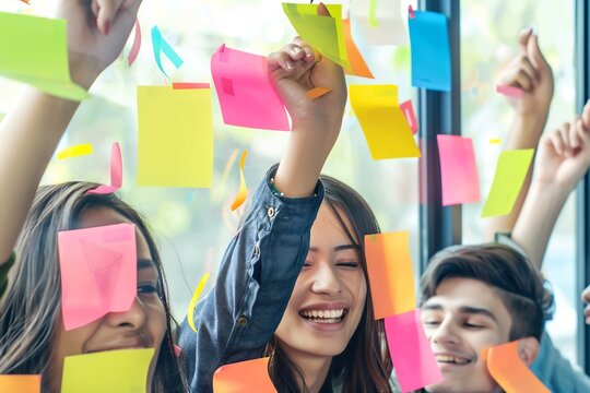 Hands raised in a collaborative meeting or brainstorming session with colorful sticky notes on the wall