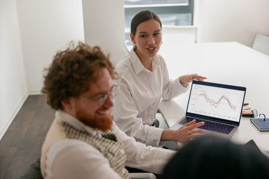 A professional environment displaying a collaborative business discussion featuring data visualization elements