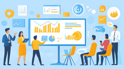 Business team analyzes data on a large screen. Charts, graphs, and other visual elements highlight key performance indicators and strategic insights during a collaborative meeting.