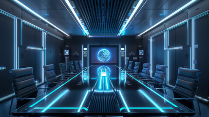 Futuristic AI-powered conference room with holographic displays and sleek, modern furniture