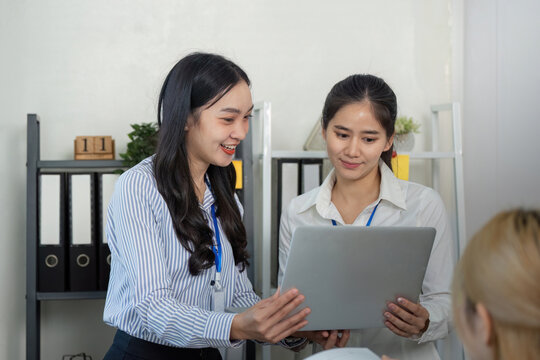 Enthusiastic Asian woman sharing insights from a laptop with a colleague during a collaborative meeting in a bright office